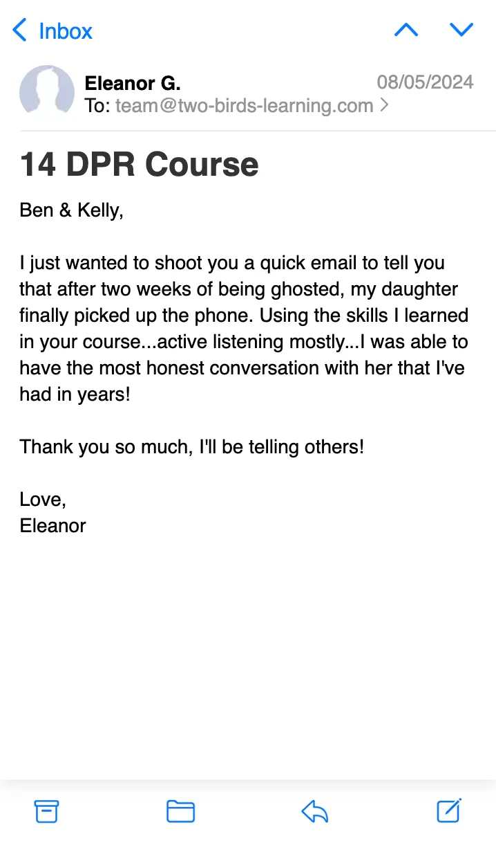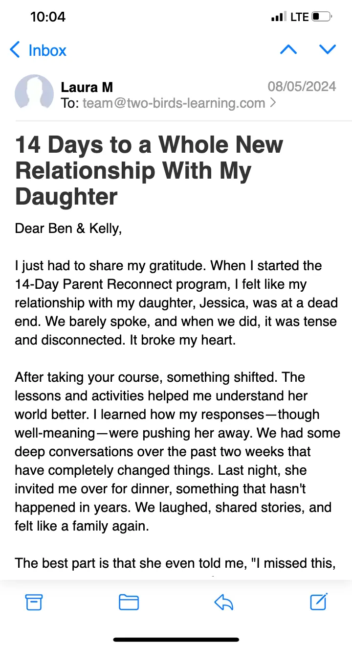 But let’s be honest—you’re probably not here to learn all about us. What you really want to know is: CAN WE ACTUALLY HELP YOU? Since launching the 14-Day Parent Reconnect Course, we’ve seen parents transform their relationships in ways they never thought possible. This course is practical, straightforward, and effective, so you can start seeing results right away. We’re excited to be part of your journey, and we can’t wait to see the amazing changes you’ll make. We’ll be hosting weekly Q&A calls in our private community, and we look forward to meeting you soon!